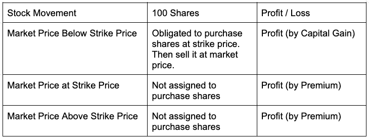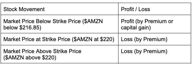 E.g. If you BUY a PUT option of $AMZN with a strike price of $220 with an expiration period of 1 month and this costs you a premium of $315. This means, $AMZN stock will have to go below $216.85 to make an actual profit.